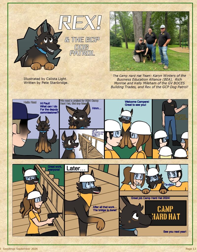 If you aren’t a regular visitor to the GCPF, you may not have met or heard of Rex. Well, introductions are thus in order. Rex is the official park mascot, and a welcoming ambassador to the Park. He is sometimes seen patrolling the trails with his friend Pete, looking for fallen branches or trees, welcoming school children arriving for educational programs, or leading the monthly dog hikes through the Park – all responsibilities that he takes very seriously. So if you happen to meet Rex on one of your visits to the Park, stop and say hi and introduce yourself.